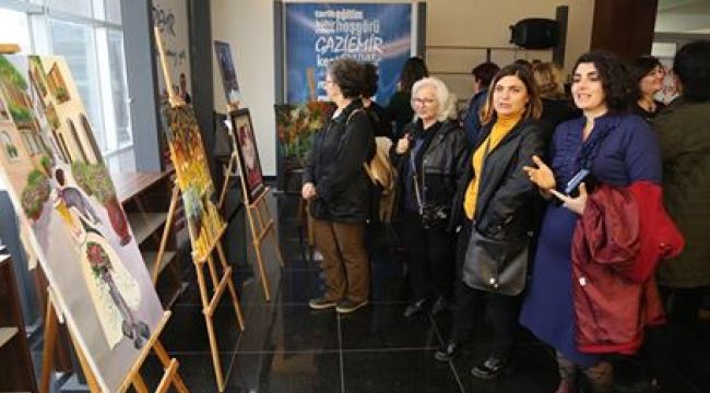 Gaziemir Belediyesi’nin düzenlediği resim kursuna katılan yetişkin kursiyerlerin karışık teknikle çizdiği resimler ‘Sevgiyle kağıda dökülenler’ isimli sergiyle sanatseverlerin beğenisine sunuldu