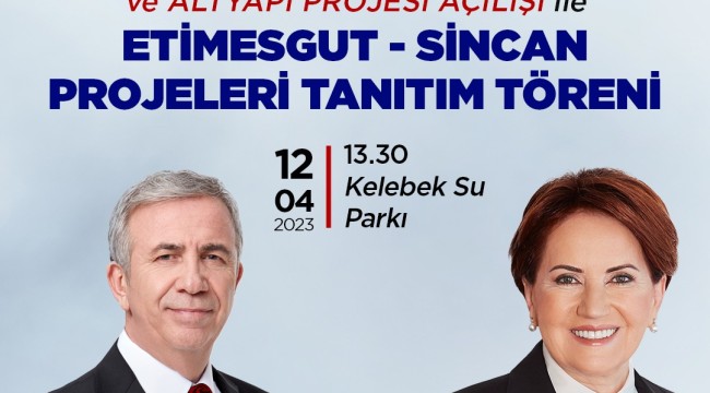 30 yıldır çözüm bekleyen trafik çilesi ve altyapı sorunları nedeniyle sel ve su baskınlarının yaşandığı İstasyon Caddesi’nde hayata geçirilen Alternatif Bulvar ve Altyapı Projesi’nin açılışının ve Etimesgut-Sincan projelerinin tanıtımının gerçekleştirileceği tören; ABB Başkanı Mansur Yavaş’ın ev sahipliğinde ve İYİ Parti Genel Başkanı Meral Akşener’in katılımıyla düzenlenecek.