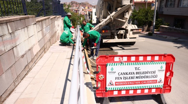 Çankaya Belediyesi ilçede yer alan 123 mahallede birden koordineli bir biçimde çalışmalarını sürdürüyor. Kaldırımların bakım, onarım çalışmalarına hız kesmeden devam eden Çankaya Belediyesi, kullanım ömrü dolan merdivenli yolları da yeniliyor.