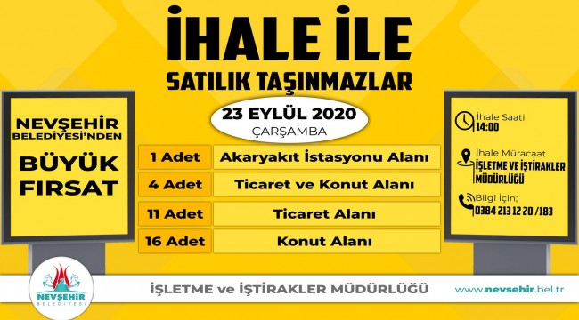 Mülkiyeti Nevşehir Belediyesi'ne ait olan 32 adet arsa, 23 Eylül 2020 günü düzenlenecek ihaleyle satılacak. Satışa sunulan arsalar; Güzelyurt, 20 Temmuz, Cevher Duduyev, Fatih Sultan Mehmet, Sümer, Mehmet Akif Ersoy, Bekdik, KırathoğluMahallelerinde bulunuyor.
