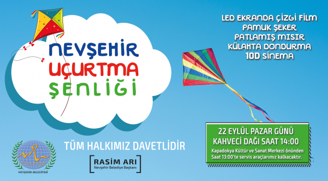 Avrupa Hareketlilik Haftası etkinlikleri çerçevesinde 22 Eylül 2019 Pazar günü Nevşehir Belediyesi Kültür ve Sosyal İşler Müdürlüğü tarafından Kahveci Dağı’nda uçurtma Şenliği düzenlenecek. Saat 14.00’da başlayacak olan şenlik için Nevşehir Belediyesi tarafından saat 13.00’da Kapadokya Kültür ve Sanat Merkezi önünden servisler kaldırılacak.