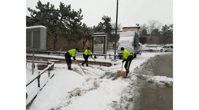 çalışmaları gerçekleştiren ekipler, bir taraftan da kar küreme çalışmaları yapıyor. Odunpazarı