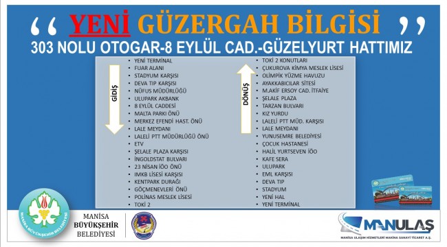 Manisa Büyükşehir Belediyesi, 2019-2020 eğitim öğretim yılının başlamasına sayılı günler kala, öğrencilerin okullarına daha kolay ve konforlu bir şekilde gitmelerini sağlamak amacıyla 303 ve 304 numaralı hatları okulların ağırlıklı olduğu Güzelyurt Mahallesi ve çevresinde hizmete sundu.