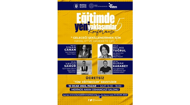 Büyükşehir Belediyesi’nin ‘Geleceği Şekillendirmek İçin Hayal Et ve Harekete Geç’ temasıyla bu yıl 5’incisini düzenleyeceği Eğitimde Yeni Yaklaşıklar Konferansı, 15 Ocak 2023 Pazar günü 12.30 – 18.00 saatleri arasında Atatürk Kongre ve Kültür Merkezi Osmangazi Salonu’nda gerçekleştirilecek. Bursa’daki tüm eğitimciler ve eğitime gönül verenlere açık olan ücretsiz konferansta, Prof. Dr. Sinan Canan, Prof. Dr. Belma Tuğrul, Doç. Dr. Yavuz Samur ve Doç. Dr. Burak Karabey, sunumlarıyla eğitim modellerinde yeni yaklaşımları ele alacak.