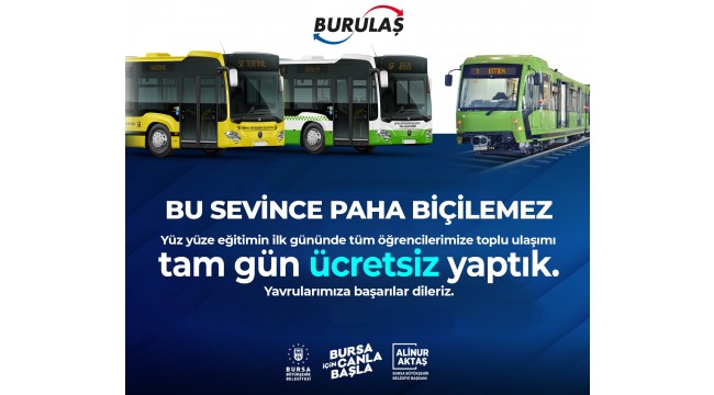 - Bursa Büyükşehir Belediyesi'nden binlerce öğrenciye ücretsiz ulaşım sürprizi geldi. Bursa'da 2021 - 2022 eğitim öğretim döneminin ilk günü olan 6 Eylül Pazartesi günü otobüs ve raylı sistem araçlarına kartlarını okutarak binen tüm öğrenciler için ulaşım gün boyu ücretsiz olacak.