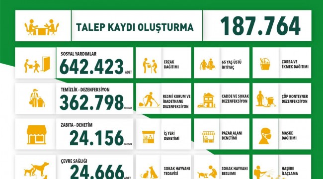 Osmangazi’deki koronavirüs ile mücadele çalışmaları kapsamında 13 Mart-15 Eylül tarihleri arasında toplam 187 bin 764 talep kaydı oluşturan Osmangazi Belediyesi ekipleri, vatandaşların taleplerini karşılamak için yoğun mesai harcıyor. Belediye ekipleri, bugüne kadar 642 bin 423 sosyal yardımda bulunurken, 362 bin 798 noktada temizlik ve dezenfeksiyon, 24 bin 156 noktada zabıta denetimi, 24 bin 156 noktada çevre sağlığı çalışması ve 15 bin 692 noktada park ve bahçe temizlik ve bakımı gerçekleştirdi.
