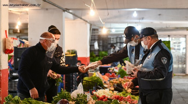 Kent genelinde hijyen ve temizlik çalışmalarını yürüten Büyükşehir Belediyesi toplum sağlığını korumak amacıyla özellikle vatandaşların yoğun olarak kullandığı pazar yerlerinde hijyen denetimlerini artırırken, pazarcı esnafına ve vatandaşlara ücretsiz maske ve siperlik desteği vermeye devam ediyor.