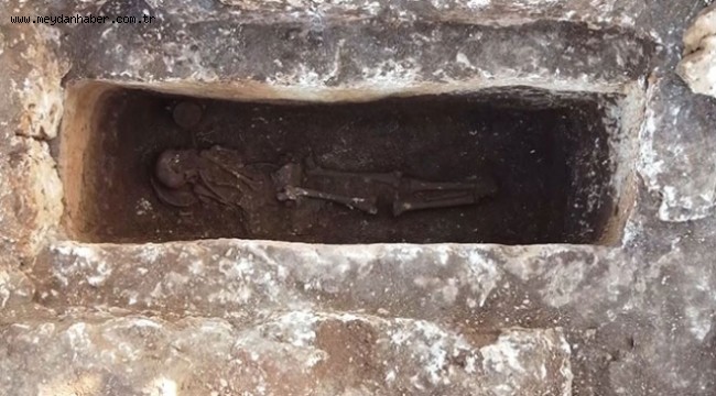 Merdivenin sol tarafında sanduka şeklindeki mezarda bir iskelet bulundu. Kemiklerin büyük kısmının çürümeden günümüze kadar geldiği iskeletin 1500 yıllık olduğu tahmin ediliyor.