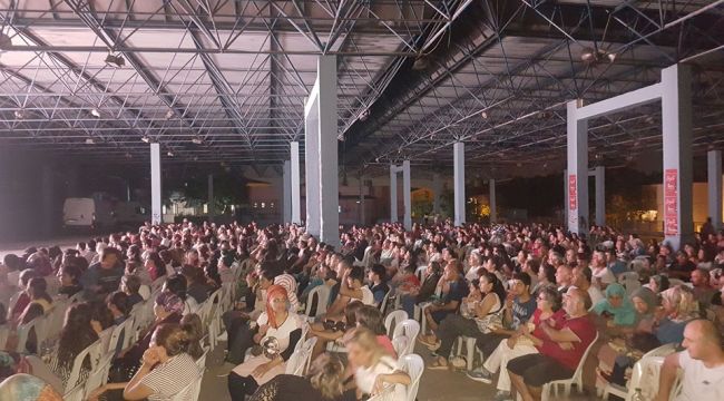 Naci Çakır Mahallesi Pazar yerinde kurulan sahnede Organize işler Sazan Sarmalı filmini izleyen