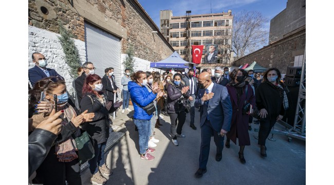 İzmir Büyükşehir Belediyesi’nin 8 Mart Dünya Emekçi Kadınlar günü etkinlikleri kapsamında Basmane’deki tarihi Bıçakçı Han’da düzenlediği Kadın Emeği Sergi ve Satış Pazarı açıldı. Büyükşehir’in 2020 yılının Ekim ayında satın alarak yeniden kent yaşamına kazandırdığı Bıçakçı Han, üreten emekçi kadınların kurduğu stantlarla ve tarihi Basmane bölgesinin kültürel özelliklerini yansıtan ürün ve atölye çalışmalarıyla ilk misafirlerini ağırladı. İzmir Büyükşehir Belediye Başkanı Tunç Soyer, eşi ve İzmir Köy-Koop Birlik Başkanı Neptün Soyer ile birlikte Kadın Emeği Sergi ve Satış Pazarı’nı gezerek üretici kadınların 8 Mart Dünya Kadınlar Günü’nü kutladı, bereket testisini kırarak sergi ve pazarının bereket getirmesini diledi.