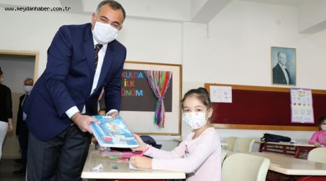 Birinci sınıfa yeni başlayan öğrencilerle sohbet eden Taşdelen, çocuklara kırtasiye seti de armağan etti.