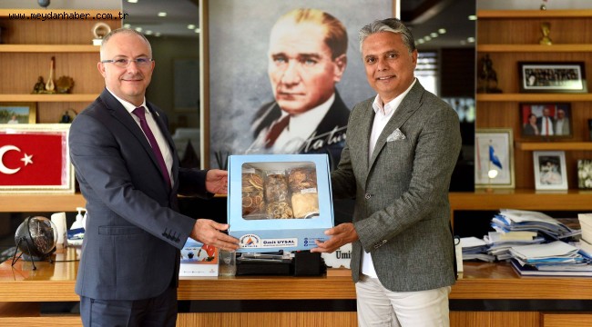 Başkan Uysal, Beyazbayram’a belediyenin parklara diktiği turunçlardan Antalya Kadın Girişimi Kooperatifi’nin yaptığı ve içinde şekerlemeden reçele birbirinden farklı tatların olduğu sepeti hediye etti. Başkonsolos Beyazbayram, görev süreci içinde gösterdiği yakın ilgi dolayısıyla Başkan Uysal’a teşekkürlerini dile getirdi.