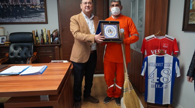 Ziyarette Temizlik Personeli Ahmet Çiftlikli’ye plaket takdim eden Başkan Tokat; “Ahmet arkadaşımız