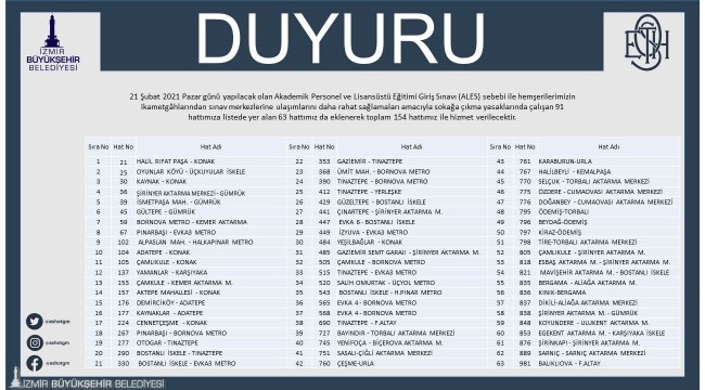 İzmir Büyükşehir Belediyesi ESHOT Genel Müdürlüğü, 21 Şubat Pazar günü yapılacak ALES’e özel sefer programı oluşturdu. Sokağa çıkma kısıtlılığı nedeniyle 91 hatta hizmet veren kurum, sınava girecek vatandaşlar için ek 63 hatta daha sefer yapacak.