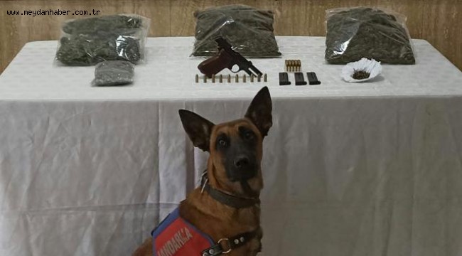 Jandarma ekiplerinin dedektör köpek yardımıyla düzenlediği operasyonda, 1 kilo 40 gram kubar esrar, 5 kök kenevir, 1 tabanca ve şarjör ile 27 fişek ele geçirildi.