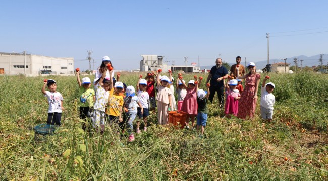 Turgutlu Belediyesinin kente kazandırdığı önemli projelerden birisi olan ve okul öncesi eğitimi ücretsiz yaparak Türkiye’de bir ilke imza attığı Çocuk Kültür Sanat Merkezi öğrencileri “Dersimiz Tarla” etkinliğine katıldı. Kültür ve Sosyal İşler Müdürlüğüne bağlı faaliyetlerine devam eden Çocuk Kültür ve Sanat Merkezinde eğitim gören öğrenciler tarım kenti olan Turgutlu’da çiftçilerin yıl boyu emek vererek yetiştirdiği domates tarlasının hasat edilmesine tanıklık etti. Etkinlik kapsamında çocukların, “Milli ekonominin temeli tarımdır” diyen Gazi Mustafa Kemal Atatürk ilkelerini benimsemeleri, kentin marka değerini yükselten salçalık domates ile tanışması, tarımsal üretimin ve sağlıklı beslenmenin aile ve insan hayatındaki önemini kavraması amaçlandı. Öğrenciler ayrıca sıcak günlerin yaşandığı kentte tarım işçilerine soğuk su ikram ederek dayanışma ve emeğin önemini yerinde öğrenmiş oldu.