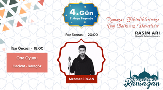 Nevşehir Belediyesi tarafından bu yıl ilk kez düzenlenen Ramazan Etkinliklerine ünlü birçok yazar, şair ve sanatçı konuk oluyor. Etkinliklerin 4. Günün de bu akşam sanatseverlerin yakından tanıdığı Yazar, Şair ve Radyo Programcısı Mehmet Ercan sahne alacak.