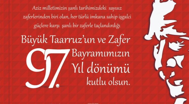Aziz milletimizin şanlı tarihimizdeki sayısız zaferlerinden biri olan, içinde bulunduğu tüm yokluklara ve imkansızlıklararağmen her türlü donanıma sahip işgalci güçlere karşı şanlı bir zaferle taçlandırdığı Büyük Taarruz’un ve Zafer Bayramımızın 97. Yıl dönümünü milletçe büyük bir gurur ve onurla kutlamanın mutluluğunu yaşıyoruz.
