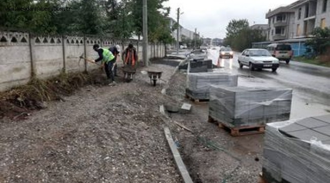 Düzce Belediyesi Fen İşleri Müdürlüğü ekipleri tarafından çalışma programına alınan yerlerde çalışmalar tüm hızıyla devam ediyor. Ekipleri yağan yağmur da durdurmadı.