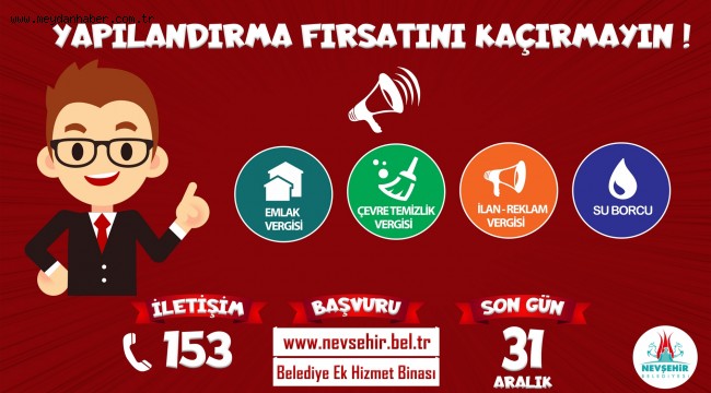 Nevşehir Belediyesi, 7256 sayılı kanun kapsamında belediyeye olan borçları peşin veya taksitli olarak yapılandırma fırsatı sunuyor. Yapılandırma için son başvuru tarihi 31 Aralık olarak belirlendi.