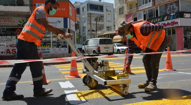 yoğun olduğu cadde ve sokaklarda yaya geçidi çizgilerini yeniliyor.