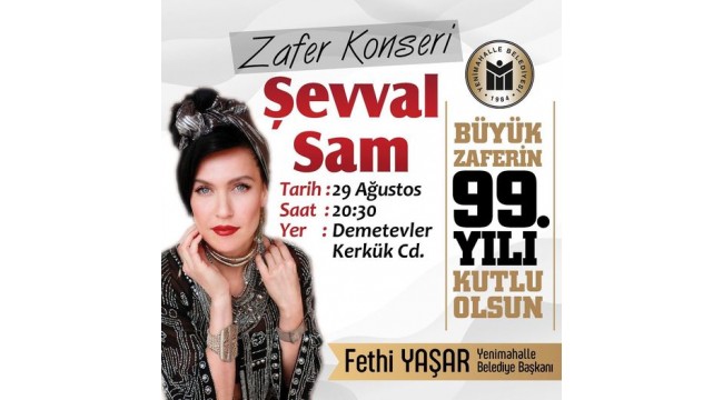 Vatandaşların yoğun katılımı ile gerçekleşecek olan Zafer Bayramı kutlamaları 29 Ağustos Pazar günü saat 20.30’da Demetevler’de düzenlenecek olan dev konser ile başlayacak. Türk müziğinin sevilen sesi Şevval Sam birbirinden güzel şarkıları Yenimahallelilerle birlikte