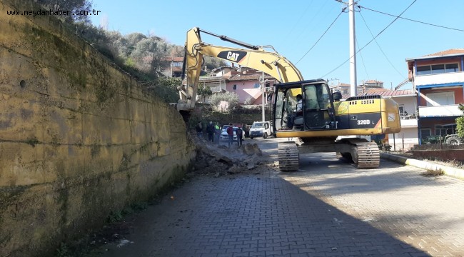 YIKILMA TEHLİKESİ BULUNAN İSTİNAT DUVARI, BELEDİYE EKİPLERİ TARAFINDAN YIKILDI
